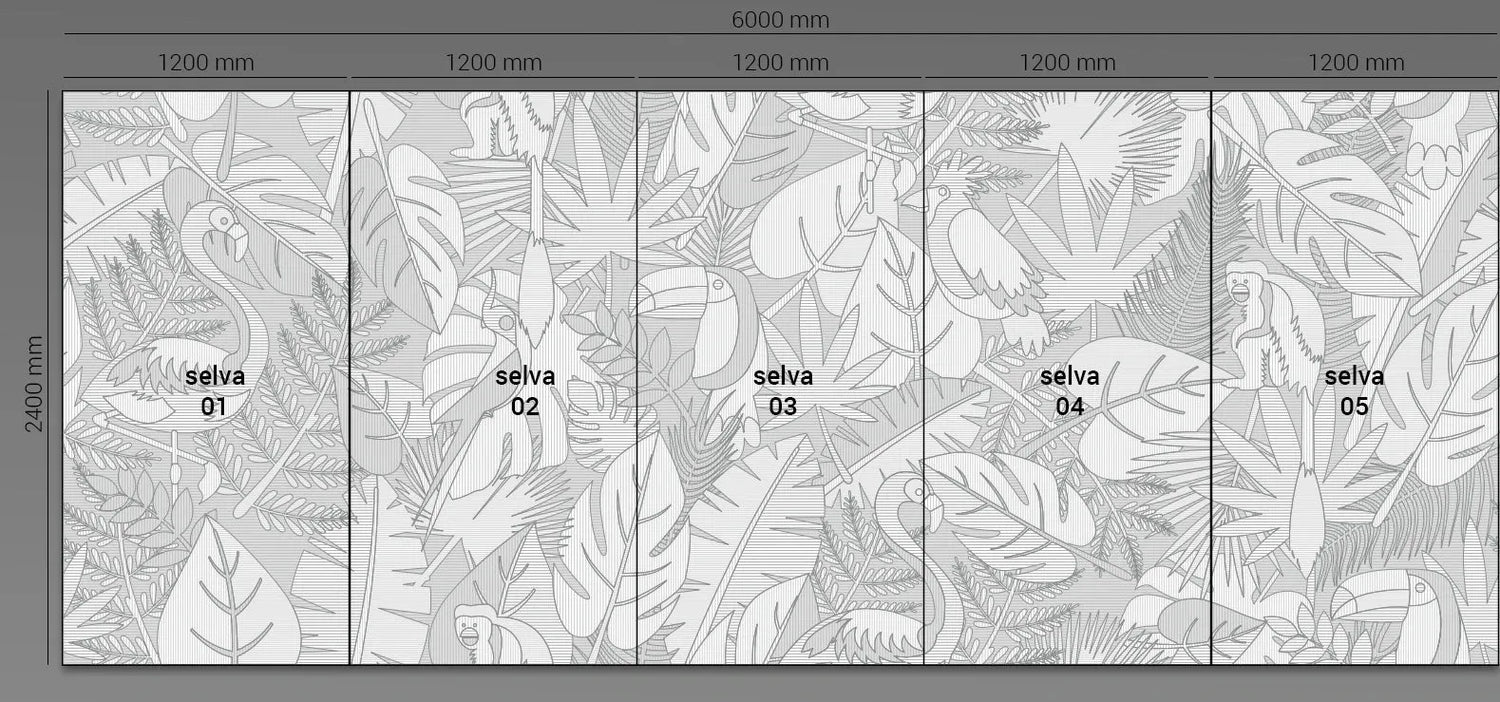 Selva Polyptych (Set Of Five Panels) pattern is inspired by tropical rainforest. These decorative MDF wall panels are made of 16 mm HMR medium-density fibreboard and routed with a rainforest pattern. Selva Polyptych includes five panels of 2400x1200x16mm to cover 14.4m², routed with a continuous pattern. Panels are coated with white solvent-based primer and ready to paint.
