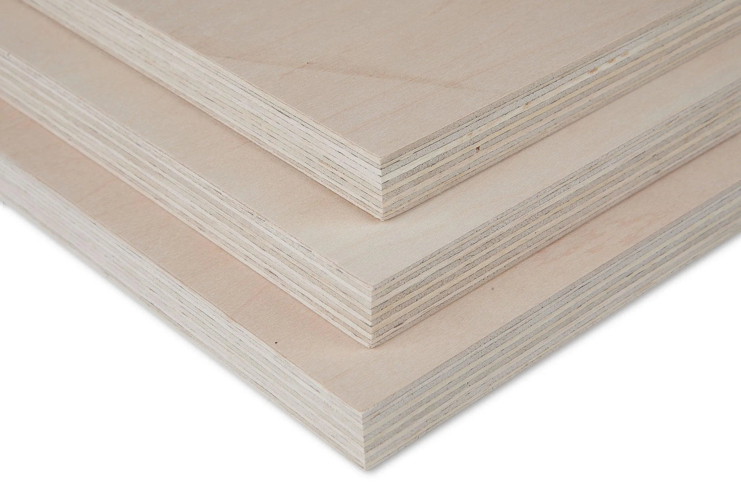 Standard size of a plywood sheet is 2440 x 1220 mm, with thicknesses ranging from 3 mm right up to 40 mm for birch plywood.